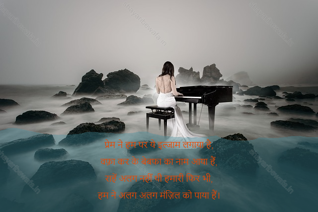 प्रेम ने हम पर ये इल्जाम लगाया है,वफ़ा कर के बेबफा का नाम आया हैं,राहें अलग नहीं थी हमारी फिर भी,हम ने अलग अलग मंज़िल को पाया हैं।